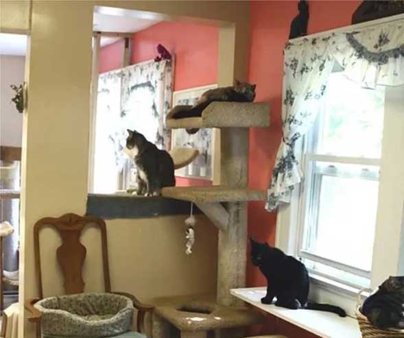The residence is meticulously clean and comfortable with cageless habitats filled with toys, scratching posts, loveseats and shelves for sunning. A myriad of sleeping places abound with carpeted cubbies and an outdoor screened-in cattery with a direct water view.